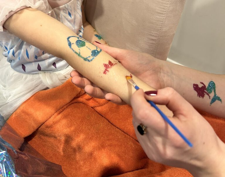 Während der gebuchten Schminkzeit kann zusätzlich ein hochwertiges Glitzertattoo-Set genutzt werden. Die Kinder wählen ihr Lieblingsmotiv aus den vorbereiteten Schablonen sowie ihre gewünschte Glitzerfarbe. Das Auftragen übernimmt eine zuverlässige „große“ Person (z. B. ein Elternteil, ältere Geschwister). Vor Beginn gebe ich eine kurze Einweisung (ca. 10 Minuten) zur Anwendung und zum hygienischen Umgang mit den Materialien.